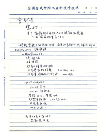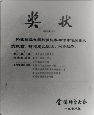 (1978年,上海合成纤维研究所“碳纤维腈纶原丝、聚酰亚胺纤维”项目获全国科学大会奖) 1981年 3月,组织领导的“高强Ⅰ型聚丙烯腈原丝和碳纤维小试”项目在国内率先通过鉴定。“高强Ⅰ型碳纤维及原丝中试”项目于1986年获纺织工业部科技进步二等奖。