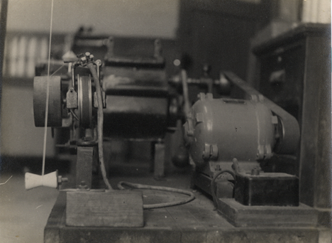 (上海合成纤维实验工厂卡普隆车间的土法纺丝机) 4月,卡普隆小组在既无工艺又无设备的困境下,自行设计制造土设备,参照化工设备仿制高压釜,自制炉栅纺丝机,在试验室样机上成功纺出中国第一根合成纤维——锦纶6丝。