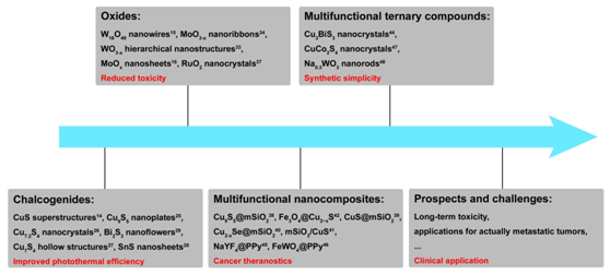 尽管医疗技术发展迅速,但癌症仍然是人类生存的巨大威胁。光热治疗(PTT)是一种用于癌症治疗的微创方法,选择性好、不损害正常细胞。近来,由于近红外区域(NIR)的吸光度强,光热转换效率高,因此铜硫族化物半导体成为极具前景的光热剂。然而有效PTT的最小激光功率强度仍然显著高于人类皮肤暴露的保守极限。提高光热转换效率和降低激光功率密度已成为PTT发展的方向。此外,为了提高治疗效果,可以将光热剂与造影剂或者抗肿瘤药物、光敏剂和放射增敏剂整合来制备许多多功能纳米体系,从而获得诊断治疗一体化和联合治疗的协同效应。