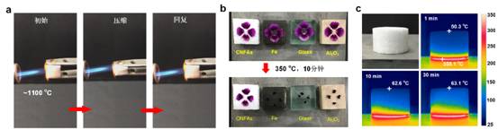 (图2(a)弹性陶瓷材料在1100摄氏度高温火焰中的压缩回复性能,(b)不同材料隔热性能对比,(c)弹性陶瓷材料在350摄氏度下的红外成像照片)