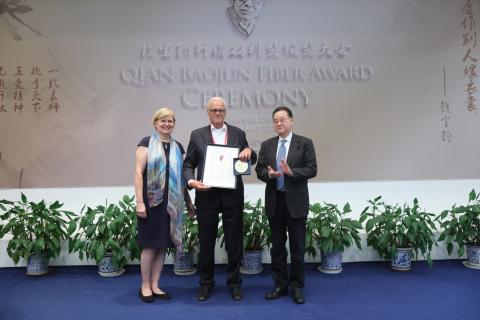 (程正迪为“钱宝钧纤维材料杰出贡献奖”获得者原埃因霍芬理工大学的皮特·雷姆斯特教授颁奖)