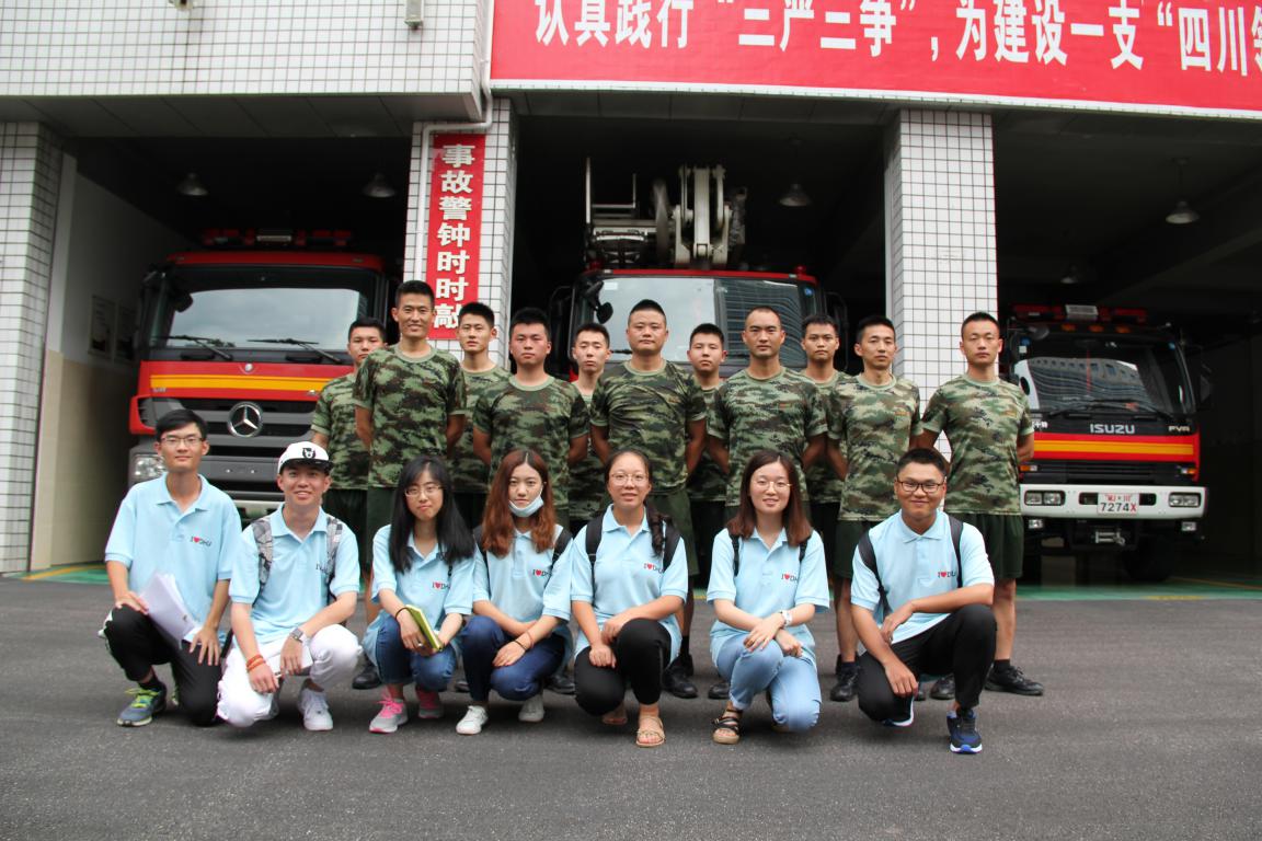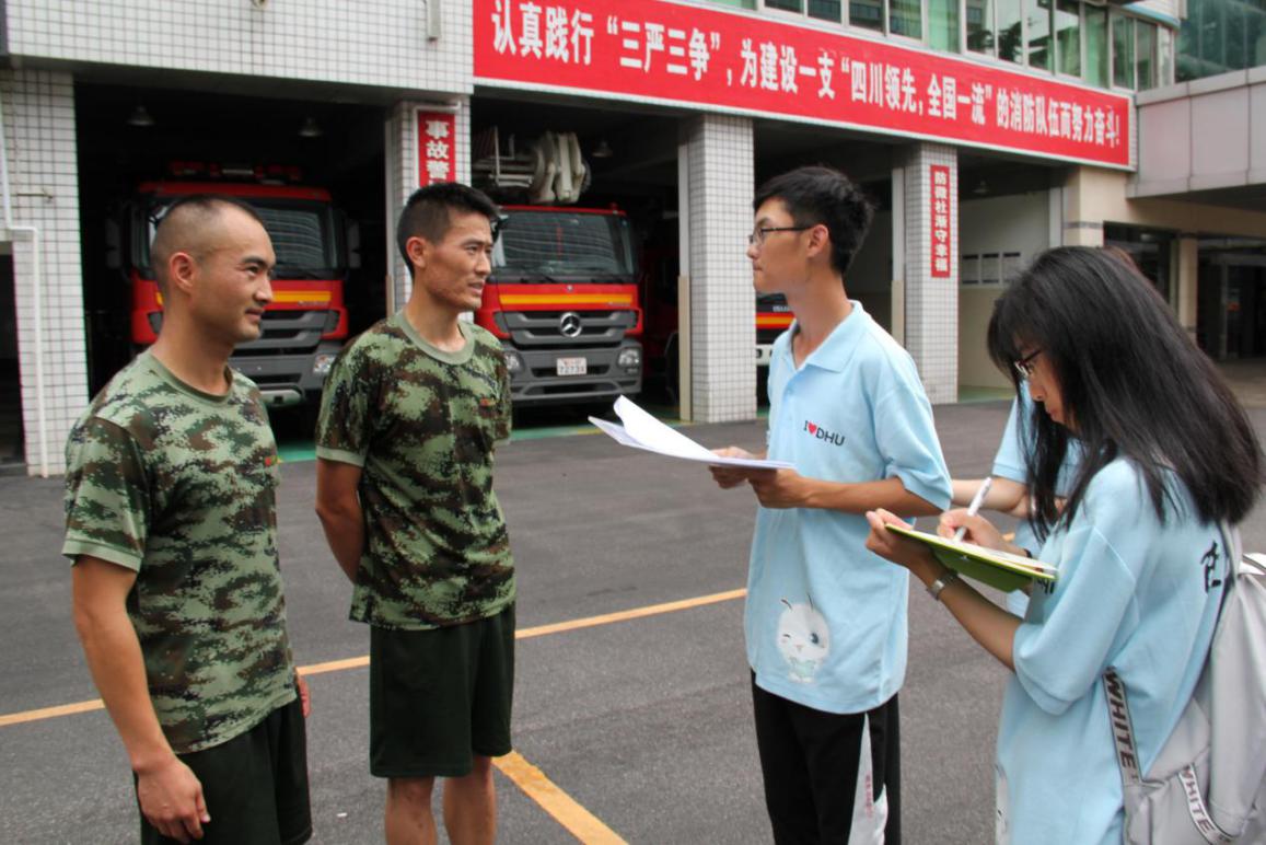 实践团成员绵阳之行第一站来到了绵阳市公安消防支队,由于消防局工作的特殊性,不便与其取得联系,起初实践团对于此次调研的成功与否并不确定。抵达绵阳市公安消防支队后,门口站岗的士兵首先接待了实践团,在了解了实践团的目的后,他便向上级汇报了此事并通知实践团在门口稍作等候。之后,一名身着迷彩服的领导从办公楼走出,同意了实践团的采访要求。陈指导命令两名曾参与过“5·12”汶川特大地震救援工作的两名老兵出列,接受实践团的采访。