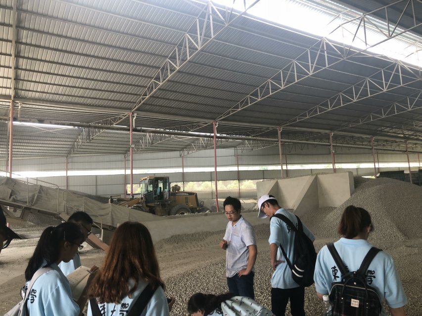 随后,尹主任带领实践团同学们进入了厂区。厂区堆放了大量的鹅卵石,尹主任向实践团同学们讲解了为了考虑环境保护问题和资源再生问题,现在建材公司的石材选用问题——鹅卵石拥有高强度低成本的特点,已经在工业生产中大批量使用。为了让实践团同学更好的明白整个砂浆的生产流程,尹主任带领同学们近距离观察砂浆生产流程,让同学们有了更深刻的了解。