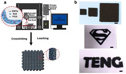 为了解决这一难题,游正伟教授团队基于新近发展的热固性材料3D打印新技术(Mater. Horiz., 2018, DOI: 10.1039/C8MH00937F),构筑了具有三维立体多孔结构的纳米摩擦发电机(3DP-TENG)。该3DP-TENG利用聚癸二酸甘油酯(PGS)为热固性弹性基材和一种摩擦材料,碳纳米管(CNTs)分散其中构成导电网络和另外一种摩擦材料。制备中以PGS预聚物、CNTs和盐粒为打印墨水。其中盐粒是关键,作为增强剂保证打印固化成型,同时作为致孔剂获得了多孔结构,每个微孔相当于一个纳米摩擦发电机。当被挤压时,微孔上下管壁接触,PGS和CNTs之间由于对电子束缚能力的不一样,在接触时二者间发生电荷转移。由于3DP-TENG是弹性的,因此外力撤去时,微孔恢复原状,电荷被分离在上下管壁的PGS和CNTs中,从而在CNT与大地之间产生电势差,加上外导线就构成了电流。大量的微孔协同工作,从而获得了良好的摩擦发电效能