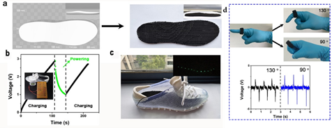 由于是3D打印一体成型,3DP-TENG可以根据需要方便地定制。研究团队依人体工学打印了三维鞋垫,穿上步行时可以有效点亮LED灯和对电子表进行充电。而3D打印的“指环”状器件则可以根据输出的电信号,方便地监控手指的弯曲,感知弯曲的频率和角度。