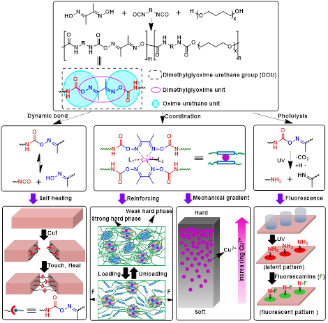据此游正伟教授团队提出了利用多反应性基团在一个材料里构筑多重防护性能的新思路。将具有室温可逆动态裂解、金属配位、光解等多重反应性的丁二酮肟氨酯基团引入到聚氨酯材料中,相应地获得了同时具有强韧、力学梯度、室温自发自修复、荧光性能多合一防护材料(图1)。