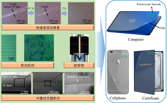 图2集快速室温自修复、耐穿刺、强粘合、荧光防伪于一体的多功能防护膜