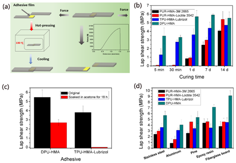 在上述研究工作的基础上,团队进一步提出将肟氨酯动态键引入交联的聚氨酯结构中,构筑了动态交联的聚氨酯热熔胶黏剂(DPU-HMA)(图1),其结合了热塑性与反应型聚氨酯热熔胶的优点,同时克服了二者的缺陷,表现出了优异的性能。