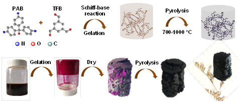 针对这些挑战,BETVICTOR纤维材料改性国家重点实验室廖耀祖教授团队以低廉的工业产物副品红碱和均苯三甲醛为原料,借助简单的席夫碱反应,通过反复试验筛选溶剂类型、调控单体浓度及反应温度,设计合成富氮有机多孔聚合物纳米球凝胶(ACS Appl. Energy Mater. 2018, 1, 6535)。聚合物自身存在的超交联结构、丰富的内部氢键作用以及纳米球之间的点对点接触,赋予其较高的比表面积、良好的机械强度和热稳定性能。通过简单的高温热处理,不涉及超临界或冷冻干燥过程,一步法成功地制备了一种新型氮掺杂炭气凝胶(nitrogen-doped carbon aerogel,简称NCAs)。