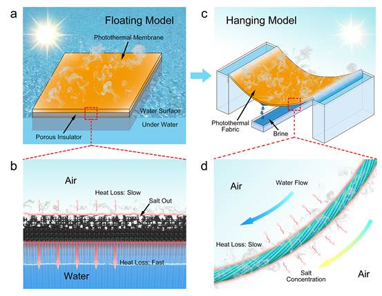 悬挂式蒸发模型的提出,在增加了蒸发速率的同时避免的析盐现象。通过调节可产生饱和的卤水,对下游的多种工业领域均有意义,该模型不仅在太阳能光热海水淡化领域展现出极大前景,还对其他污水处理装置的发展具有借鉴意义,极具产业化前景。