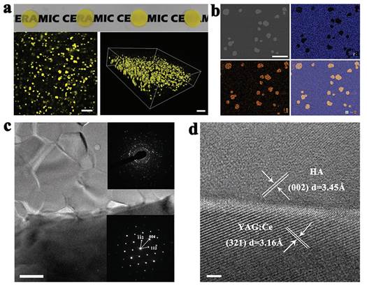 图2. 复合荧光陶瓷的实物图、激光共聚焦电镜图、SEM图及TEM图
