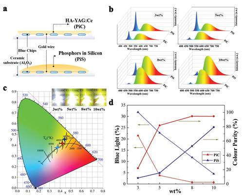 进一步制备HA基复合荧光陶瓷,得益于介孔HA粉体的高烧结活性以及快速低温烧结制度(850℃,<10 min),荧光粉均匀分散于陶瓷基体内,且无界面反应。从而较好地保留了荧光粉原有的发光性能,其外量子产率达原始荧光粉的90%以上。利用HA基复合荧光陶瓷作为光转换材料,以贴片式封装技术,进一步组装得到高性能白光LEDs。与硅胶封装的LED相比,该LED外量子效率更高,热稳定性、发光稳定性更为优异。