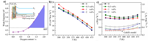 图3. a) Ti3C2Tx/BST的低能量载流子散射机理图,b) 功率因子以及c) 热导率变化图