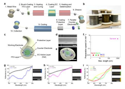 彩色纤维作为织物和服装的基本构成单元,广泛应用于日常生活中。工业上通过染整技术,连续化制备上千米的彩色纤维,从而实现彩色纤维的大规模商业应用。近些年,随着可穿戴电子产品的日益普及和智能服装概念的兴起,开发智能变色纤维,并将其应用在可穿戴显示、视觉传感和自适应伪装等领域,受到越来越多的关注。然而在现有的染整工艺中,染色后的纤维颜色无法可控地改变,导致智能变色纤维的连续化制备难度极大,也因此限制了彩色纤维的应用。