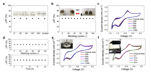 金属纤维表面涂覆的ITO层可有效减少电致变色活性层中离子与金属电极之间的副反应,从而极大地提高了电致变色纤维的电化学稳定性。300次循环后,纤维变色效果几乎不变。电致变色纤维外层的聚合物保护层有效提高了纤维的环境稳定性。电致变色纤维在100次弯折、100次水洗、20 h光照和30 h加热后仍具有较好的变色效果。