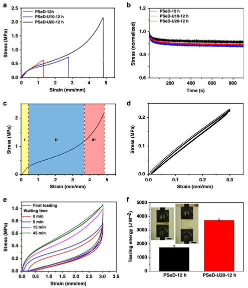 图2、仿生皮肤PSeD-U弹性体的机械性能。a 共价交联密度相同的情况下,不同氢键密度的PSeD-U-12h弹性体应力-应变曲线。b 样品拉伸至5%形变后900 s内的应力松弛曲线。C 应力随应变的关系图,根据应变区域的不同可将应力-应变曲线分为三部分。d 形变30%的循环拉伸测试。e 不同间隔时间下,300%循环的应力-应变曲线。f 样品PSeD-12h与PSeD-U20-12h撕裂能的比较。