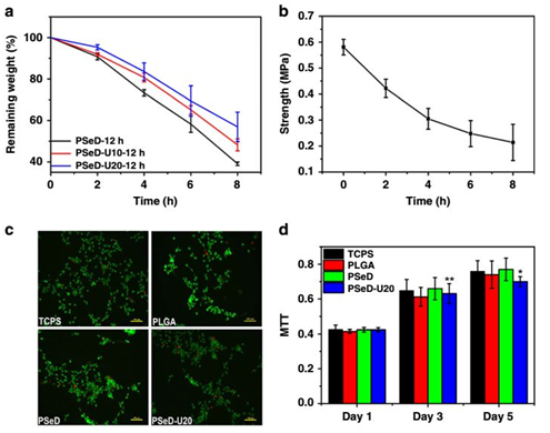 图3、PSeD-U弹性体的降解行为及细胞相容性。a 37 oC下,PSeD和PSeD-U弹性体在脂肪酶DPBS(0.1 M)中的体外降解性。b 不同降解时间后(0,2,4,6,8 h),应变200%时,PSeD-U20-12h的拉伸强度,表明力学强度的逐步降低。c NIH3T3成纤维细胞在TCPS、PLGA、PSeD和PSeD-U20活/死检测中的图像。表面活细胞数量多(绿色),死细胞少(红色),说明PSeD-U具有良好的生物相容性(放大倍数=×100;比例尺= 100μm)。d NIH3T3成纤维细胞培养在TCPS、PLGA、PSeD和PSeD-U20弹性体上的MTT分析。同一时间点不同材料间无显著性差异。与前一时间段比较,差异有统计学意义标注为*p < 0.05或**p < 0.01。