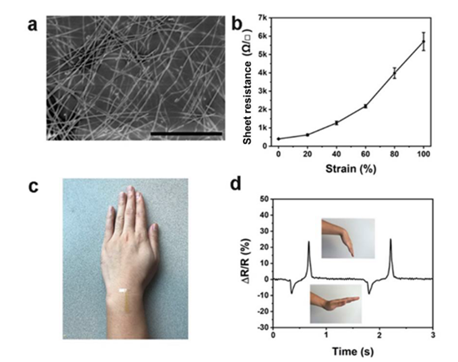 图5、电阻式应变传感器。a PSeD-U20-12h 薄膜表面银纳米线 SEM 图。b复合导电膜的应变和电导率关系。c应变传感器贴附到手腕的照片。d手腕弯曲导致应变传感器电导率的变化以及相对应的手腕动作照片。