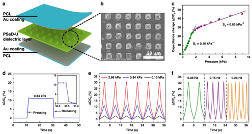 为了证明PSeD-U弹性体在生物集成电子领域的应用潜力,作者制备了一种基于微结构PSeD-U20-12h弹性体介电膜的压电传感器(如图4)。该传感器在低压时(p <2 kPa)的灵敏度为0.16 k Pa−1,高压时(2 < p < 10 kPa)的灵敏度为0.03 kPa−1。此外,在循环压缩试验中,它表现出良好的稳定性和较小的迟滞性。