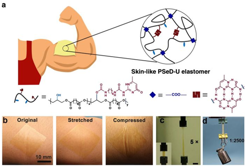 在中国科公司与科睿唯安公司联合发布的《2018研究前沿》报告中,“可拉伸材料和器件”被列为化学与材料科学领域第三大前沿热点,以生物集成电子为代表的可拉伸电子器件包括电子皮肤、可穿戴电子、人机交互接口和植入式器件的发展尤为迅猛。同时具有仿生力学特性(非线性粘弹性、软而强韧、优异的弹性)和生物学特性(生物相容性和可降解性)的弹性体是研制该类器件的基础,然而目前仍然非常有限。