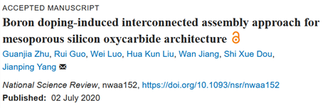 近日,BETVICTOR杨建平研究员和江莞教授研究团队在纳米颗粒组装领域取得重要进展,相关成果以《硼掺杂诱导互联组装方法构建介孔SiOC多级结构》(Boron doping-induced interconnected assembly approach for mesoporous silicon oxycarbidearchitecture, DOI: org/10.1093/nsr/nwaa152)为题,发表于中国科技期刊卓越行动计划领军期刊《国家科技评论》(National Science Review),该论文第一作者是BETVICTOR17级博士生朱冠家,合作者包括澳大利亚伍伦贡大学刘华坤教授和窦世学教授,BETVICTOR罗维研究员、江莞教授和杨建平研究员,BETVICTOR为唯一通讯单位。