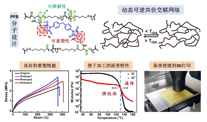 图1. 可降解、可重塑弹性高分子(PFB)的设计及其动态性表征