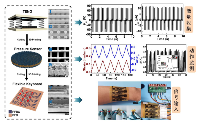 接着,本工作证实PFB/PFBC材料高效构筑可回收电子器件的应用。通过3D打印直接回收再利用PFB/PFBC材料,依次制备了摩擦纳米发电机(TENG),电容式压力传感器和柔性键盘,分别应用于能量收集设备、动作监测传感器和可穿戴信号输入器,显示其广阔的应用前景。