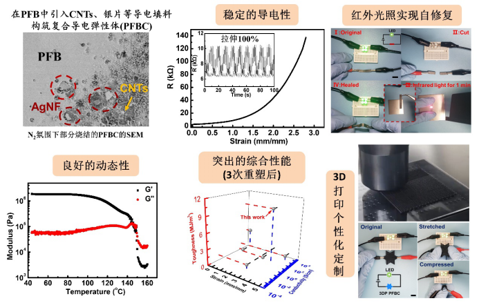 图2.导电纳米复合弹性体PFBC具有良好的导电性、自修复性、加工性和回收性等综合性能,为可穿戴电子器件的构筑提供了理想材料。