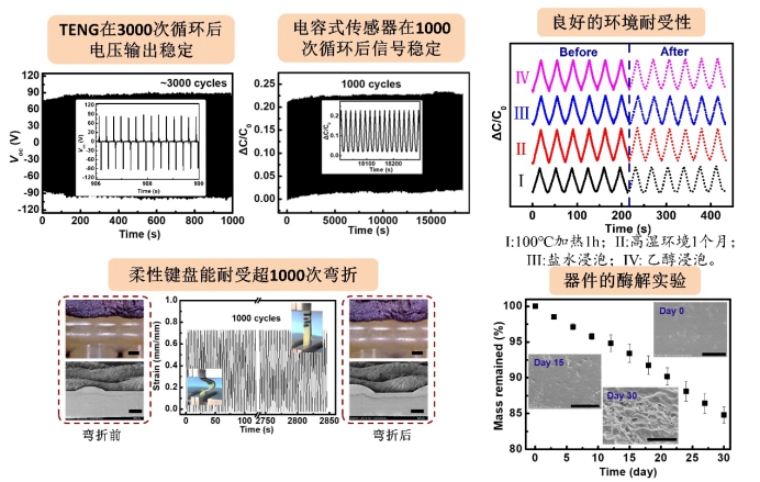 图4. 3D打印可穿戴电子器件良好的稳定性、环境耐受性及降解性。