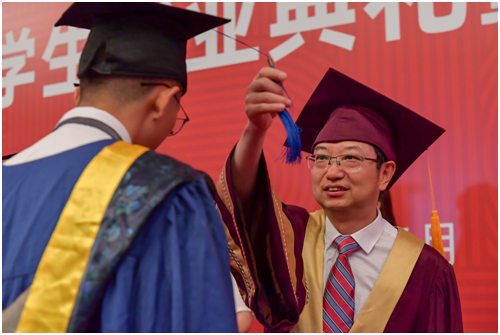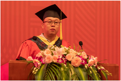 高分子科学与工程系教授廖耀祖作为教师代表为毕业生送上祝福,寄语同学们胸怀远大理想,始终秉承开放的胸襟,涵育合作共赢的智慧,怀揣人生的追求和梦想,将个人的奋斗融入国家和民族的奋斗大潮中,努力拼搏,成就精彩人生。