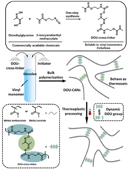 本工作的核心是基于动态肟氨酯基团的交联剂,肟氨酯键是近年来用于构筑聚合物的新兴的动态共价键,游正伟教授团队已经在该领域开展了一系列工作,实现了其室温自发自愈合,证明了其多重化学转化等特点,并基于其建立了3D打印愈合组装策略,开展了新颖的体内医学应用,设计了可任意编程的驱动器等(Adv. Mater. 2019, 31, 1901402;Adv. Funct. Mater. 2019, 29, 1901058; Mater. Chem. Front. 2019, 3, 1833; Nat. Commun. 2021, 12, 4395;Adv. Funct. Mater. 2021, 31, 2008328; Sci. China Mater. 2021, 64, 1791; Chinese J. Polym. Sci. DOI: 10.1007/s10118-021-2625-9)。本文基于肟氨酯基团设计了一种乙烯基封端的交联剂(DOU-cross-linker),其可以通过市售原料一步便捷合成。该交联剂可以溶解于常见的乙烯基单体(如甲基丙烯酸甲酯、丙烯酸甲酯),通过本体聚合得到相应的共价适应网络(DOU-CANs),这是首次提出由乙烯基单体通过无溶剂法热聚合制备CANs,与对应的传统线性聚合物相比,DOU-CANs具有优异的耐蠕变性和耐溶剂性。此外,由于肟氨酯基团的动态性,DOU-CANs还具有良好的加工性。同时,将肟氨酯基团用于聚氨酯之外的聚合物的设计,将进一步深化其研究,拓展其应用,构筑新型聚合物。该策略所用原料均商业可得,合成方法简单,聚合过程无需溶剂,具有良好的大规模工业应用的前景。