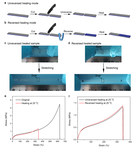 驱动器的自愈合性是实现宏观任意愈合组装策略的关键。作者考察了上述双层驱动器在切断后原位愈合和翻转后再对接愈合两种组装模式对驱动器的愈合性能的影响(图4)。由于断裂面之间的动态肟氨酯键和氢键的作用,驱动器在两种愈合模式下均展现出快速的愈合。在室温愈合15 min后,在两种模式下愈合样条均展现出了良好的力学性能的恢复,可以被拉伸到至少200%而不发生断裂。
