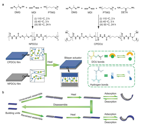 图2. 自愈合聚肟氨酯材料设计及宏观任意愈合组装策略展示