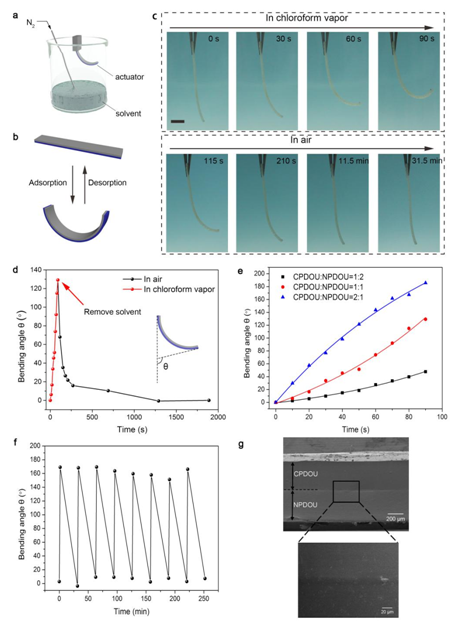 图2以双层驱动器为例,阐述了自愈合软体驱动器的构建和重构过程。交联的聚肟氨酯(CPDOU)和线性的聚肟氨酯(NPDOU)无缝愈合为一个异质结构。动态肟氨酯键在异质结构界面处重组,赋予了驱动器良好的界面结合强度。不同交联度的聚肟氨酯在溶剂中的溶胀速率和溶胀度不同,从而双层结构的驱动器能在溶剂刺激下发生可逆的变形(图3),并在循环驱动中展现了出色的稳定性。通过调整两层的几何参数可以有效调控驱动器在溶剂刺激下的变形程度。
