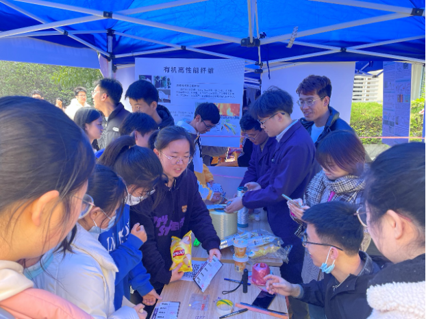 活动现场,在课题组展示区,蒙学善问泰定求真课题组、高性能纤维课题组、结构功能一体化新材料课题组、聚合物基环境能源材料课题组、聚酰亚胺材料研究中心、碳纤维课题组、先进功能材料课题组、功能材料与资源环境课题组以及功能弹性体课题组等9个课题组师生用生动的语言深入浅出地向参观同学进行介绍,全面展示了课题组长期以来的研究成果,既关注研究的科学理论,更强调产学研用的深度融合。展示内容包括柔性电子材料与器件研究、碳材料基柔性可穿戴传感器的研究、催化剂的催化转变、高容量有机负极材料及其全电池应用、功能导向共轭聚合物框架材料的设计与合成、仿生弹性体在生物医学领域的应用、材料界面调控及能源环境应用研究、贵金属纳米晶玻璃在光通信领域的应用、有机高性能纤维在消防服上的应用等多领域。先进功能材料课题组的李克睿老师表示,此次参与“材料日”展示,希望为低年级同学提供一个专业学习、科研启蒙和实践交流的开放平台,今后课题组也会持续加强与员工的互动交流,不断提升员工的专业技能水平和实践创新能力。