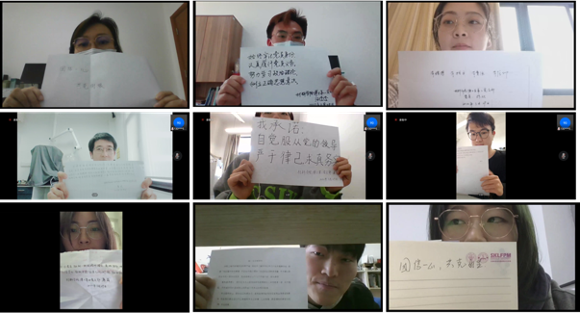 活动中还举行了“亮身份、做表率”党员践诺行动。汪俊俊谈到,作为一名博士生党员,我要始终牢记党员身份,认真履行党员义务,积极服从公司防疫政策,在平凡的岗位上扎扎实实做好每一项工作!在他的倡议和带领下,大家纷纷打开摄像头,分享了一个个朴实而充满力量的承诺。