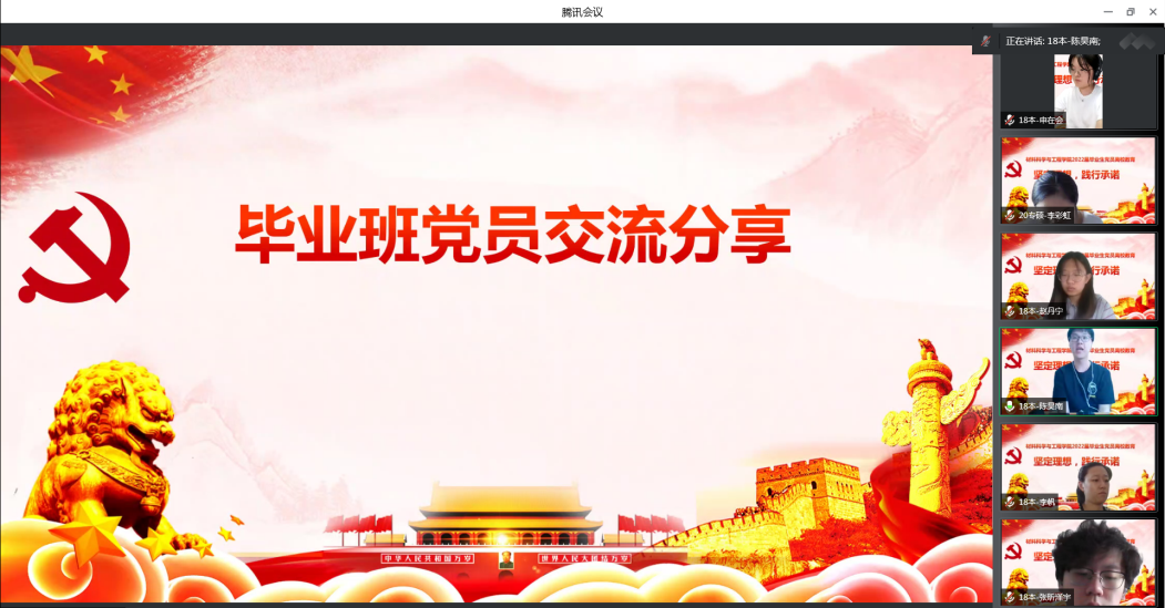 会上,全体党员重温了入党誓词,毕业生党员代表应凯明、张延婷、郑林霖、陈昊南、刘雨欣做交流分享。他们回顾了求员工活,回顾了抗击疫情时众志成城、共克时艰的经历,并表达了对全体老师的感谢。同学们纷纷表示,在今后的学习生活工作中将不断检视自己,在担当中作为,在磨砺中成长,行稳致远,笃定前行,争做堪当民族复兴重任的时代新人,在实现中华民族伟大复兴的时代洪流中踔厉奋发、勇毅前进。