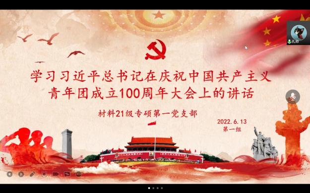 近日,BETVICTOR材料21级专硕第一党支部采用线上学习的形式开展以“学习习近平总书记在庆祝中国共产主义青年团成立100周年大会上的讲话”为主题的组织生活,会议由党支部书记孔帅同志主持。