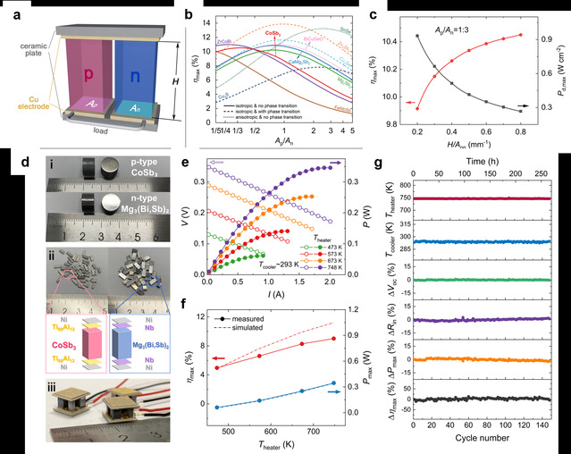 进而,利用有限元仿真对由n型Mg3(Bi,Sb)2和目前已报道的低成本、无毒的p型热电材料所构成器件的性能进行了预测及优化。最终,综合考虑材料稳定性、工艺难度等因素,选用p型CoSb3基填充方钴矿材料制备热电器件,并进一步模拟确定了器件的尺寸参数(图3a-c)。通过优化器件集成工艺,对器件进行了制备(图3d)。器件测试结果表明,在高温端为748 K,低温端为293 K时,最大转换效率超过9%(图3e-f)。并且,该器件在热循环测试中表现出良好的稳定性,经过150次热循环(约275小时)测试后,功率和效率衰减均低于5% (图3g)。