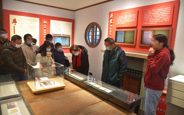 学习的第一站,师生走进陈望道故居,通过视频、图画、文物等形式全面了解了陈望道先生传奇的一生。1919年,五四运动爆发,陈望道从日本启程回国,应聘任杭州省立第一师范国文教员。在因从事语文课程改革而引发的震惊全国的“一师风潮”中,他得到了锻炼和洗礼。1920年初,陈望道因出色的语言天赋和扎实的文学素养,受到《星期评论》的邀请开始翻译《共产党宣言》, 精通日语、英语,又有出色汉语功底的陈望道,拿着邵力子捎给他的日文版《共产党宣言》和李大钊从北大图书馆借来的英文版《共产党宣言》,当仁不让地接下了这份重任。陈望道后来回忆:“当时社会上有各种思潮,因为我信仰马克思主义,所以就答应翻译了。”自此,共产党宣言点燃中国革命火种,照亮了革命者的道路。