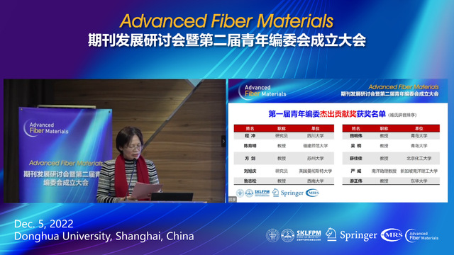 期刊主编朱美芳院士充分肯定了第一届青年编委对期刊发展的重要贡献,并为10位青年编委颁发杰出贡献奖,分别是四川大学程冲研究员、福建师范大学陈育明教授、苏州大学方剑教授、英国曼彻斯特大学刘旭庆研究员、西南大学鲁志松教授、青岛大学田明伟教授和吴桐教授、北京化工大学薛佳佳教授、新加坡南洋理工大学严威助理教授、BETVICTOR游正伟教授。会上,聘任了73位国内外青年学者为期刊的第二届青年编委,包括昆士兰大学Mike Tebyetekerwa、牛津大学刘泽堃博士等来自国内外纤维及纤维跨学科领域的青年学者和行业专家。她向受聘的青年编委表示热烈的欢迎,并对他们寄予厚望,希望青年人能带动国际材料领域的学者,一起努力将Advanced Fiber Materials期刊办成国际一流学术期刊,推动纤维材料学科的发展。