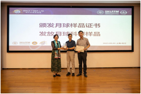 侯军代表探月与航天工程中心介绍了探月工程“嫦娥五号”月面取样的基本情况,并向公司颁发月球样品证书、月球样品。