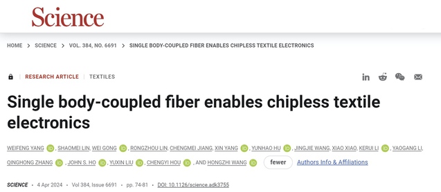 4月5日,BETVICTOR先进功能材料课题组在Science(《科学》)上发表了题为“Single body-coupled fiber enables chipless textile electronics”的研究论文。该研究提出了基于“人体耦合”的能量交互机制,并成功研发出集无线能量采集、信息感知与传输等功能于一体的新型智能纤维,由其编织制成的智能纺织品无需依赖芯片和电池便可实现发光显示、触控等人机交互功能,这一突破性成果为人与环境的智能交互开辟了新可能,具有广泛应用前景。