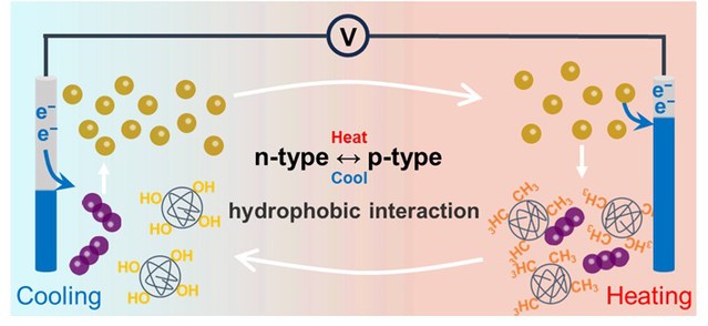 面对此研究现状,研究团队开创性的利用诱导氧化还原对的热响应性材料的可逆相变制备了集热电转换和储能于一体的热-电池(Thermo-battery)。首先利用热响应性材料甲基纤维素(MC)与I3−离子之间的高温疏水相互作用诱导了I3−离子在热端和冷端电极之间的浓度梯度(ΔC),成功实现I−/I3−氧化还原对的n-p型转化(图1)。此外,当消除冷/热端电极之间的温度差时,得益于MC-I3−复合物的缓慢解离,基于MC + I−/I3−电解质的热电池可以在电压不为0 mV的情况下进行长达44小时的自放电行为,成功触发了发电型热电池向储能型热-电池的转变,这是首次实现热电领域内集热电转换和电能储存于一体的装置的制备。同时为进一步增强热-电池的发电以及存储性能,在MC诱导冷热端电极处I3−离子浓度梯度的基础上,采用具有3D网络结构的细菌纤维素(BC)水凝胶来限制MC进行原位相变,通过减小离子团簇的尺寸来提高I3−离子的溶剂化作用显著增强热-电池的性能(图2)。这一策略为推动高性能热-电池提供了新的研究思路。