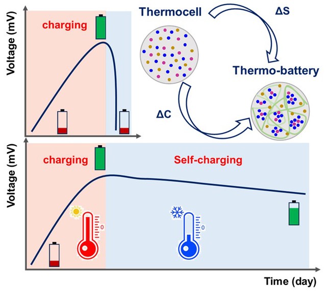 热电化学电池(热电池)可以利用电化学氧化还原电位的温度依赖性直接将热能转换为电能,与传统的固态热电电池相比,热电池凭借低成本、可扩展性、灵活性和固有的高热功率等优点被深入研究并取得了巨大进步。然而,热电池能够通过收集热能来产电的关键点是:在整个电池中要存在一个明显的温度差,以充当热电池工作的驱动力,当冷热电极之间没有温度差时,开路电压会瞬间骤降至0 V,表明其只具备发电的能力,而没有储能的性质。到目前为止,热电池的研究更多侧重于提高电池本身的热电性能和跨学科应用方面,几乎很少关注热电池在发电基础上是否还应具备存储电能的问题。