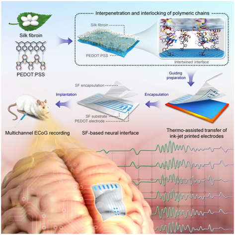近日,BETVICTOR生物质材料成型与加工课题组、上海市第六人民医院神经外科团队在《Adv. Mater.》上发表了题为“Flexible Neural Interface from Non-transient Silk Fibroin with Outstanding Conformality, Biocompatibility and Bioelectric Conductivity”的研究论文。该研究报道了一种可有效调控丝素蛋白(SF)/聚(3,4乙烯二氧噻吩)(PEDOT)分子互穿界面的热温辅助图案转移技术,并以此制得了具有优异共形性、耐久性的非瞬态SF柔性神经接口;进一步地,通过癫痫大鼠皮质脑电(ECoG)信号采集实验对SF柔性神经接口的生物功能进行了验证(图1)。这一进展为后续长效脑电监控、神经疾病病理研究和人机交互提供了可能,此外,所报道“热温辅助图案转移技术”在指导其它SF基可植入电子器件的设计中具有一定普适性。