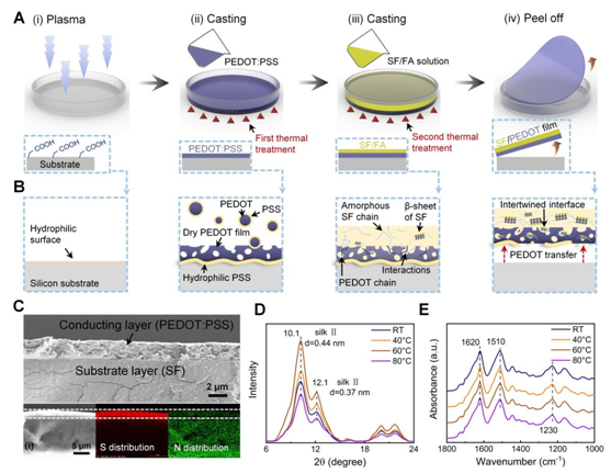 图2. 基于热温辅助图案转移技术制得的SF/PEDOT薄膜及相关表征