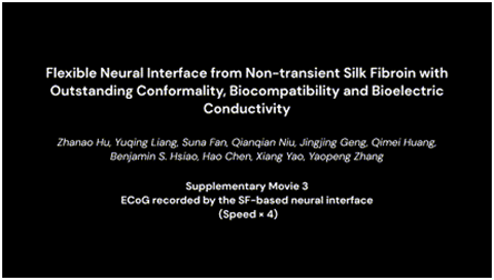 进一步地,基于热温辅助图案转移技术,研究人员成功地将喷墨打印的PEDOT电极转移至SF柔性衬底,并制得了具有6电极通道的非瞬态SF柔性神经接口(图3)。“神经接口器件前端采集点尺寸越小,所采得脑电信号越精确,此外,更小的器件尺寸也利于缩小植入创面”,论文第一作者博士生胡展翱说:“相较于现有SF基神经电极/接口材料,我们制备的SF柔性神经接在共形性、水稳定性和更小电极尺寸方面均具有较为明显的优势”。