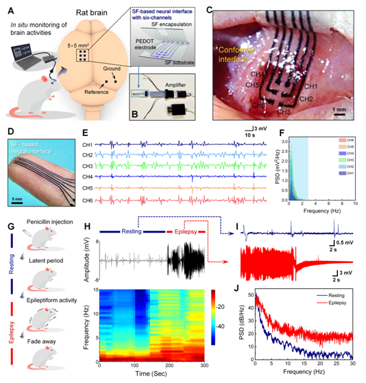 该工作还对SF神经接口生物功能进行了验证(图4)。使用SF薄膜封装后的SF神经接口成功地在麻醉大鼠脑皮质表面采得ECoG信号,且具有相比商用聚酰亚胺基神经电极更高的精准度和更高信噪比。此外,SF神经接口可用于鉴别癫痫状态下大鼠的各类脑电波,研究人员发现,通过药物诱导的大鼠癫痫发作是间歇性的,并在潜伏期(或静息)、发作期和消退阶段循环约半小时,而非过去认为的长时段处于发作期。