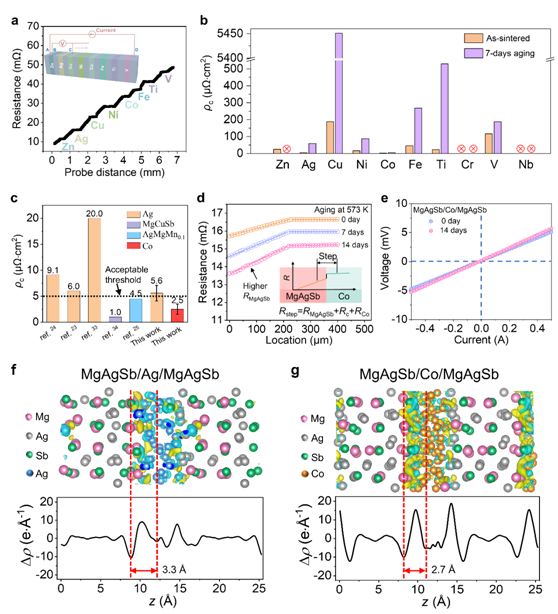 图2 (a, b, c) 高通量筛选阻挡层接触电阻率及与文献对比; (d, e) Co/MgAgSb界面老化前后接触电阻率对比; (f, g) 不同阻挡层的电荷密度差。
